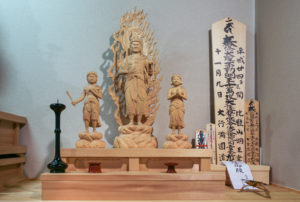 明光院本堂の、中央に座しておいでです。その前に、御神鏡があります。